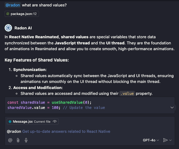 Radon AI is a dedicated React Native AI assistant enhanced with up-to-date information about the React Native ecosystem. At its heart is our extensive React Native knowledge database, which is queried before answering your question.